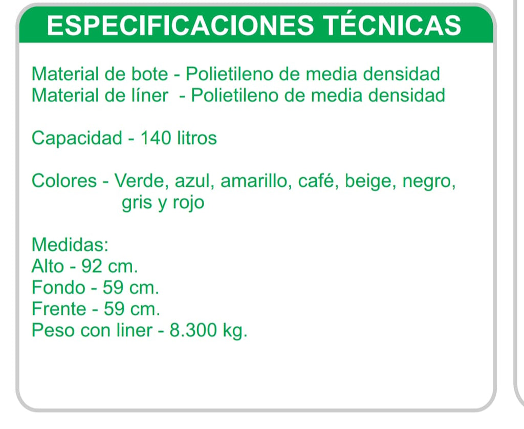 Contenedor de residuos con bote interno continuo ( 1 sola pza.) u OPCION a dos botes internos para separación de residuos, incluye tina para limpiabrisas, jalador según muestra ficha técnica, disponibles en varios colores, ideal para gasolineras, gasera, autoconsumos.